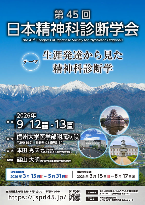 演題募集 ご登録はこちら 【受付中】3/15~5/31 参加登録 お申込はこちら 【受付中】3/15~8/17 プログラム 準備中 各種資料 ポスター(PDF) 協賛趣意書(pdf) 新着情報 2026年3月15日 演題募集・参加登録の受付を開始しましたNEW 2025年11月11日 「協賛募集のご案内」を公開しました 2025年10月1日 第45回日本精神科診断学会 専用サイトをオープンしました 過去の記事一覧